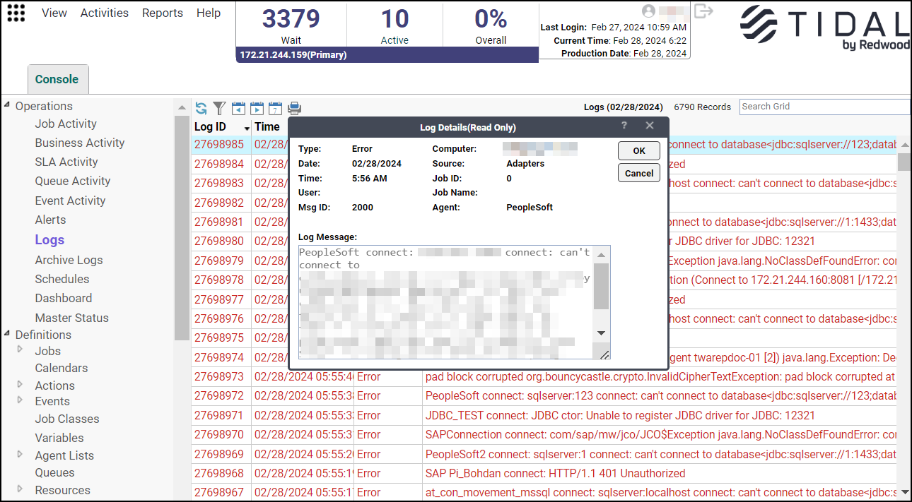 To open the Log Details dialog, double-click any individual record in the Logs pane.